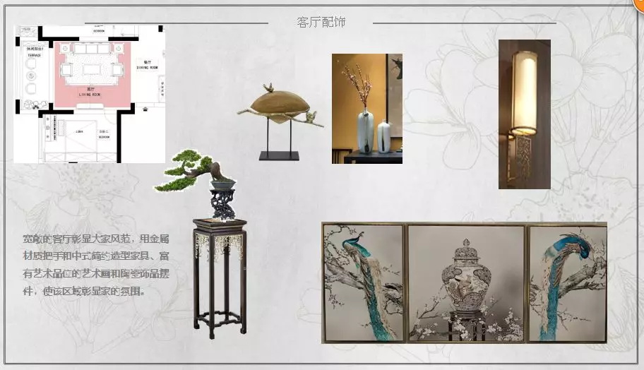 本案為新中式風(fēng)格,寬敞的客廳彰顯大家風(fēng)范,用金屬材質(zhì)把手和中式簡約造型家具、富有藝術(shù)品位的藝術(shù)畫和陶瓷飾品擺件點(diǎn)綴空間,極具古典氣息,營造中式特有的韻味和文化氣息。