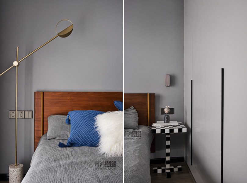 次臥以不同階度的灰色打造,色調(diào)統(tǒng)一的同時(shí)又巧妙劃出了層次,一角黑白塊樣式的小幾替代了床頭柜,是個(gè)小亮點(diǎn)。