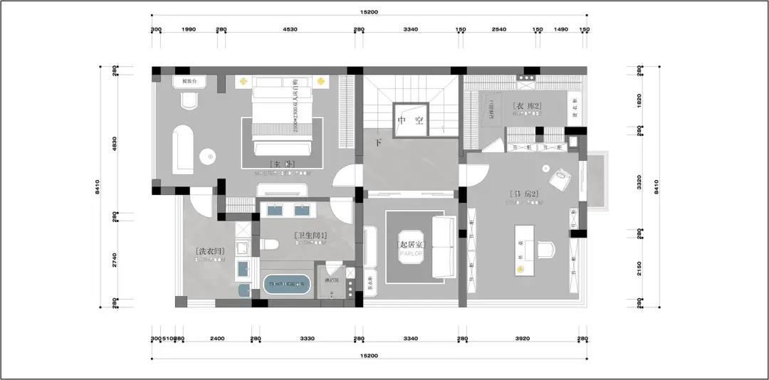 本案戶型為104方,三房兩衛(wèi)的方正結構,無暗衛(wèi)暗室,業(yè)主需求新穎的設計與當下比較流行的智能家居。