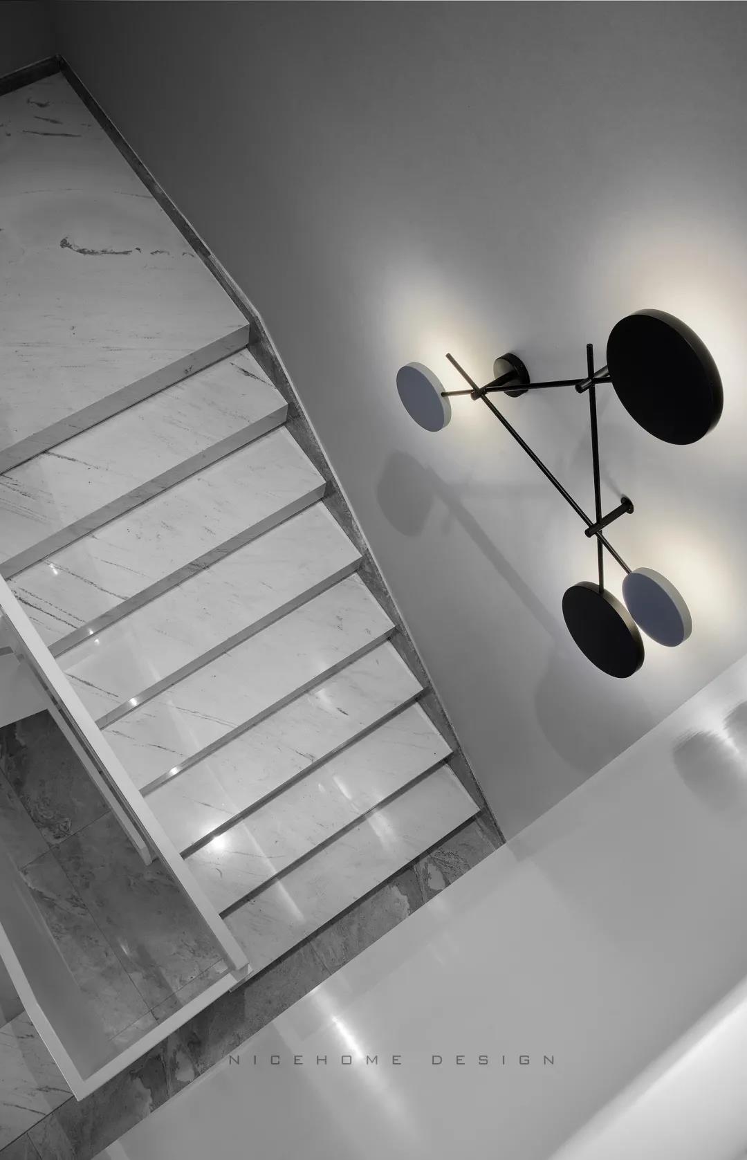 一層原結(jié)構(gòu)樓梯位置不合理,處于入戶正對口,現(xiàn)移動至西側(cè)以規(guī)避缺陷??蛷d主沙發(fā)后做一面凌空隔斷墻,增加視覺層次與進(jìn)門后的儀式感。
