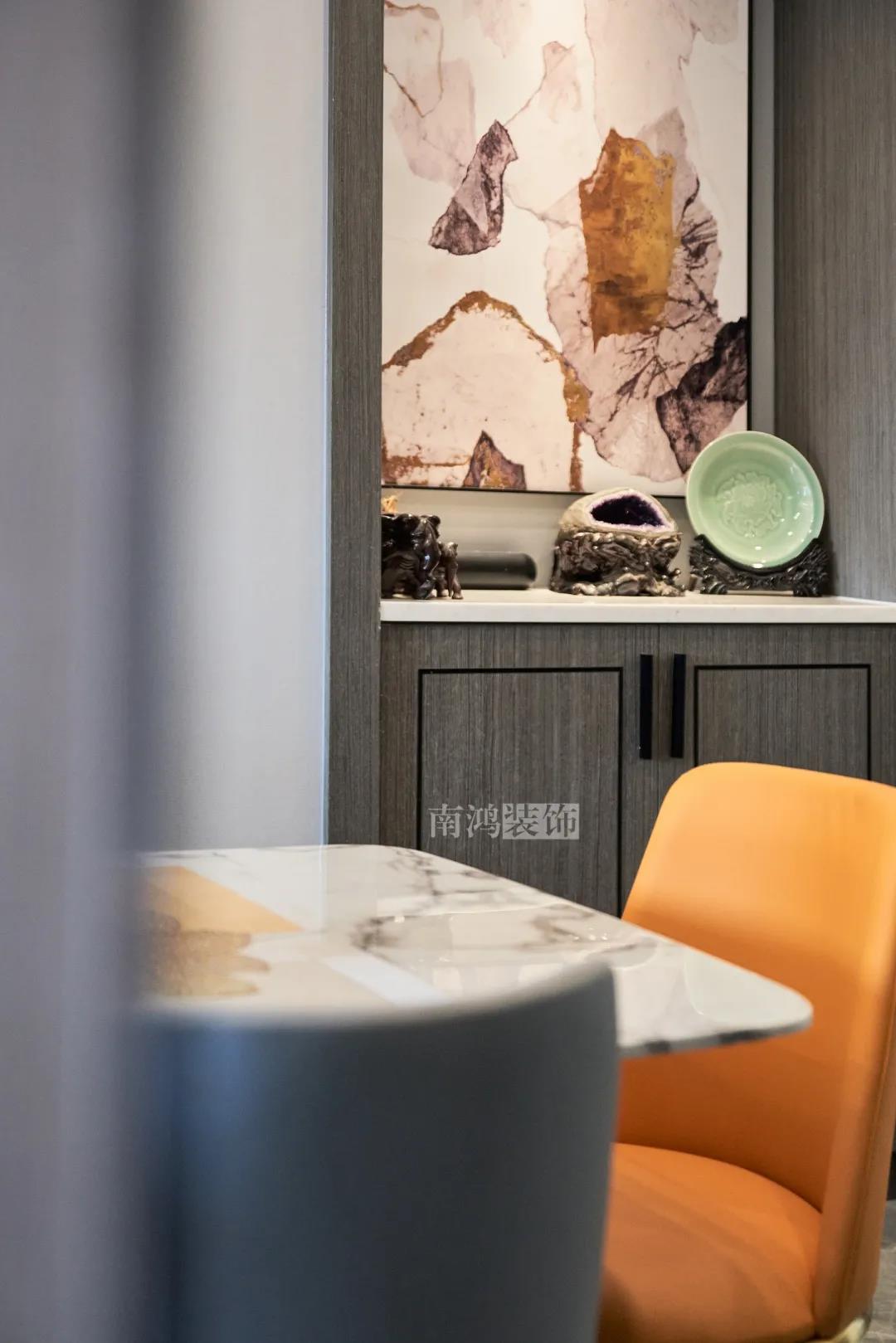 餐廳選用大理石面的餐桌搭配皮藝餐椅,金屬腳增添精致,頂面無(wú)主燈足夠簡(jiǎn)潔大氣??看芭_(tái)一側(cè)打造了西廚吧臺(tái),平??梢宰鲎龊?jiǎn)餐,用來(lái)吃早飯或品酒品茶都是很方便的。