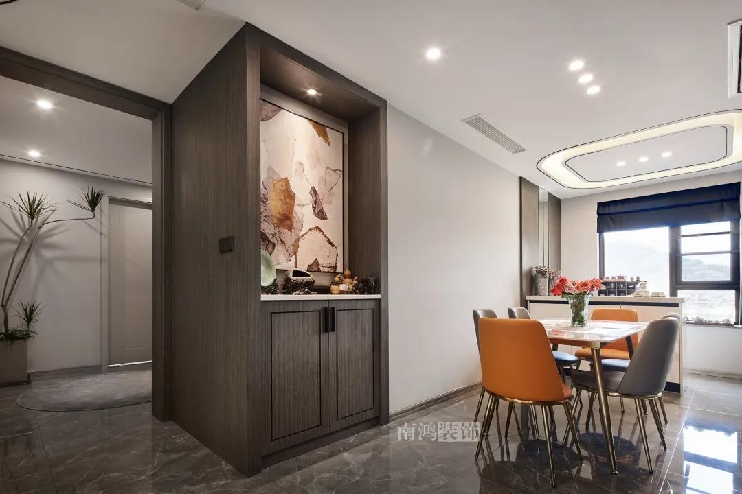 空間內(nèi)的輕奢精致與現(xiàn)代的簡(jiǎn)約美感結(jié)合得恰到好處,吊頂一路鋪展至餐廳,南北連貫性極好。