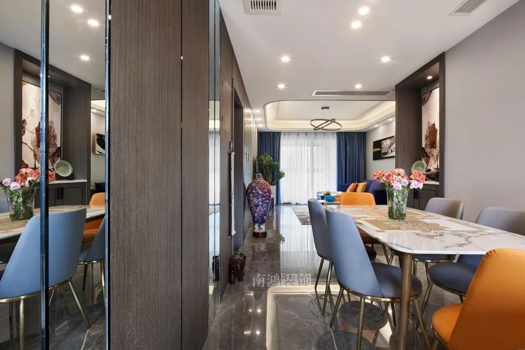 本案的主材有大理石,木飾面,金屬,絨布,皮革等,整體大氣美觀,黑白灰中點(diǎn)綴有寶藍(lán)、愛馬仕橙等個(gè)性色彩,質(zhì)感細(xì)節(jié)融匯于整個(gè)空間。