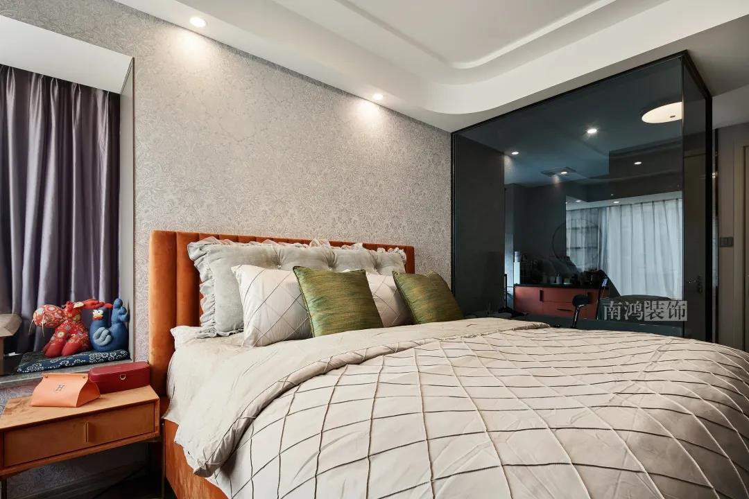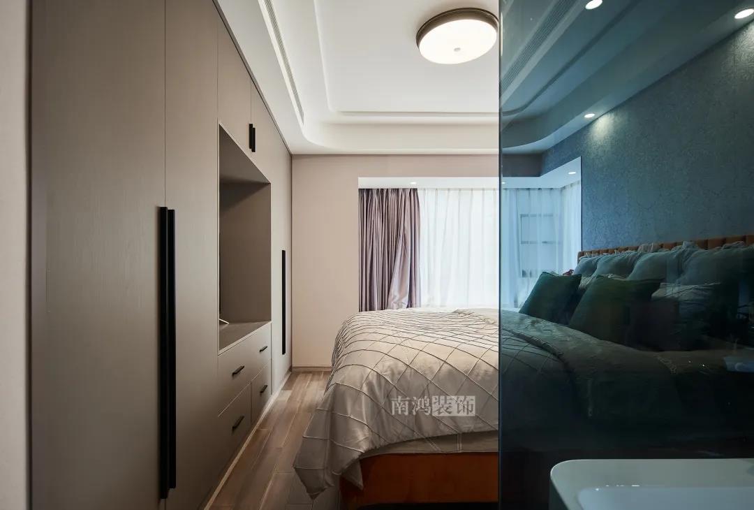 主臥背景墻應(yīng)屋主的喜好選用了淺色的藝術(shù)墻紙,沿窗打造休閑飄窗,床尾則是整排的定制柜體用作日常收納。主衛(wèi)與睡眠區(qū)之間以玻璃相隔,改善了暗衛(wèi)采光。