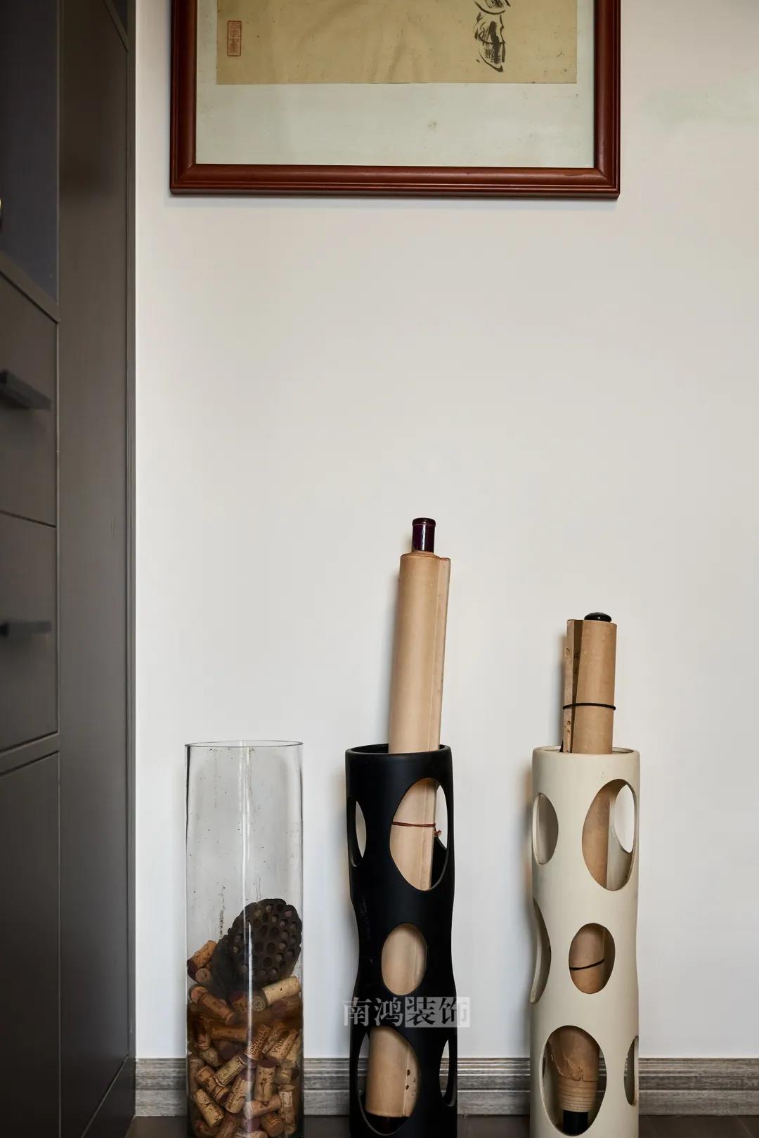 木飾面隱形門背后為次臥空間,顏色亮麗的古典瓷器綴于其中,成為點(diǎn)睛之筆。
