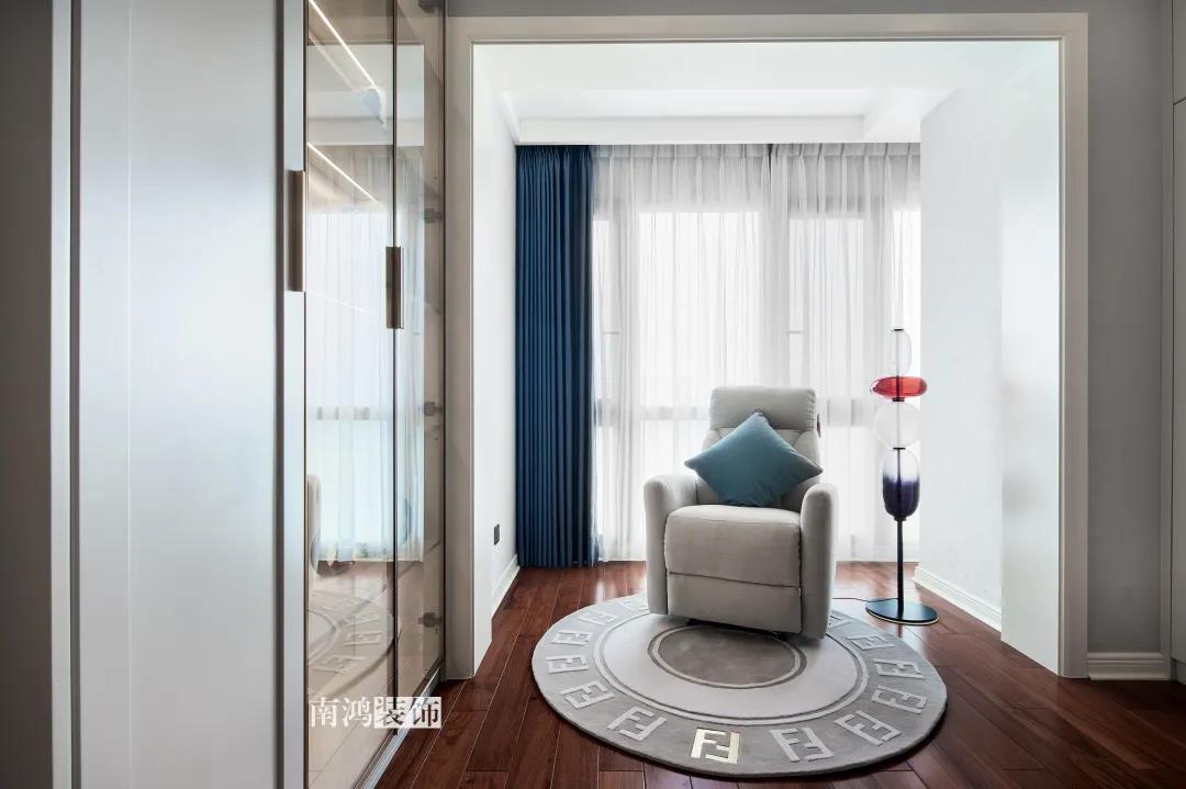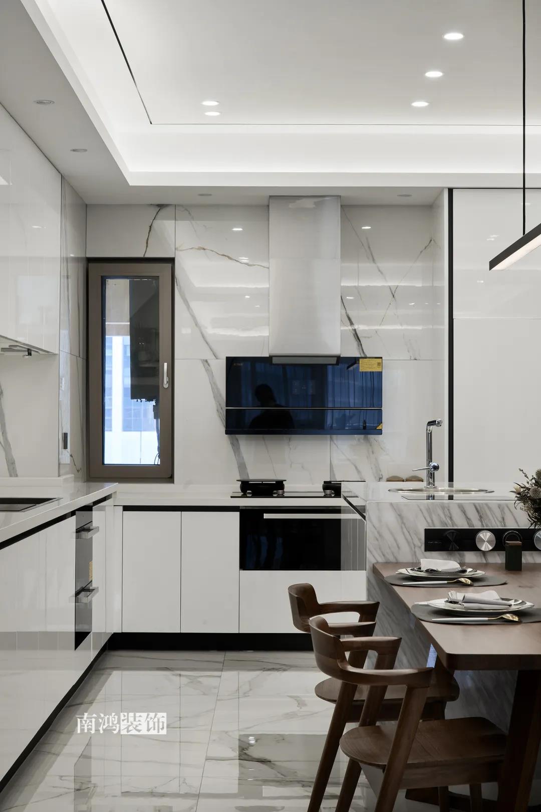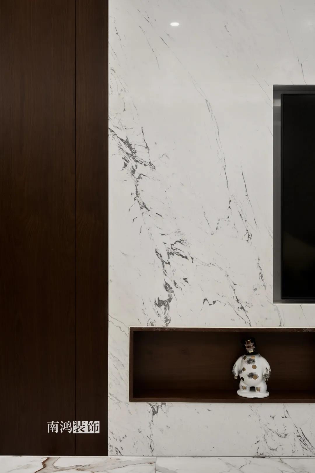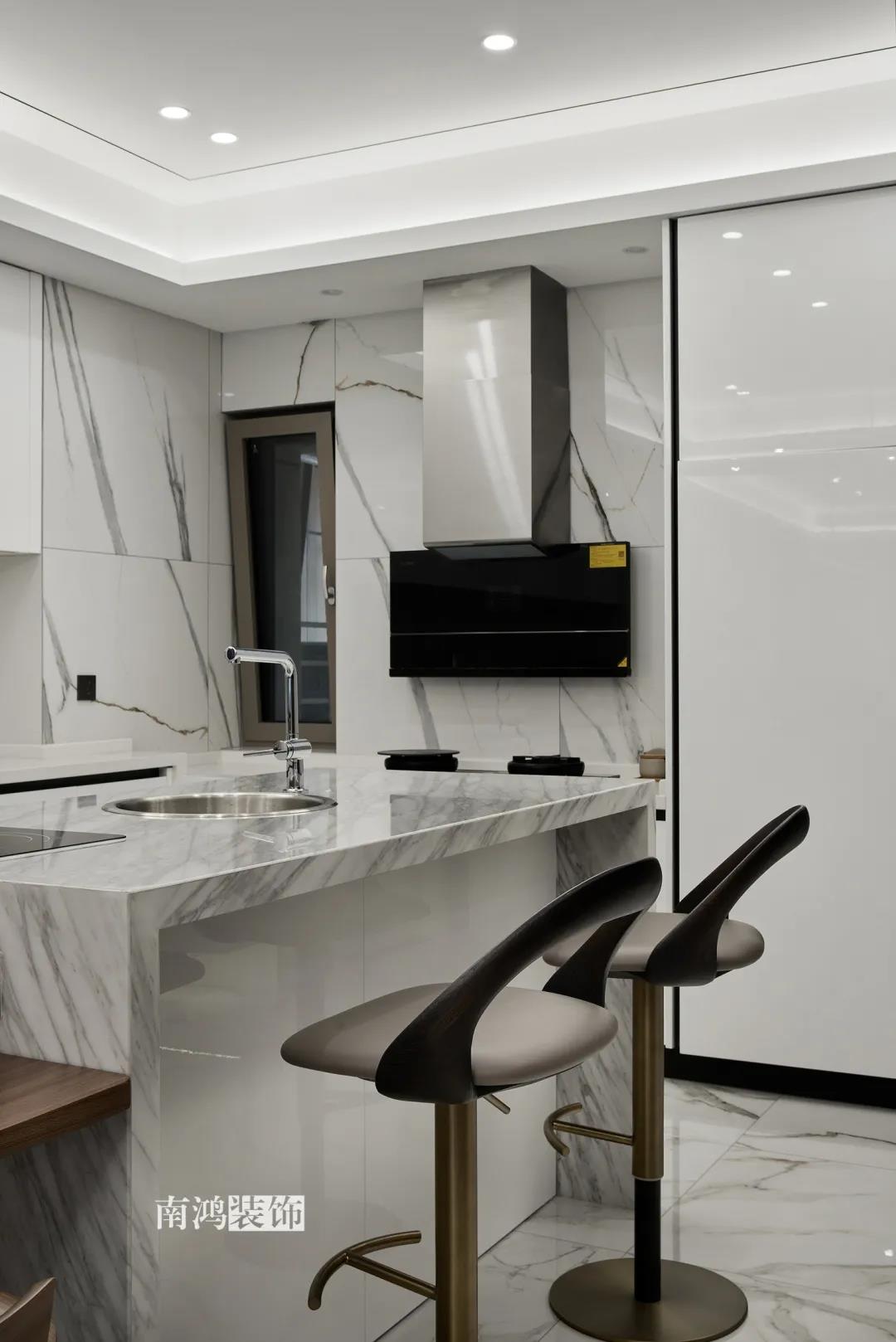 業(yè)主是一對(duì)年齡45歲左右的夫妻,事業(yè)穩(wěn)定,家庭幸福。夫妻二人熱衷各類(lèi)美食料理,所以對(duì)家里廚房的設(shè)計(jì)更加重視。 總體來(lái)看,戶型面積很大,三室兩廳的格局留給了公區(qū)域相當(dāng)寬敞的可使用空間。設(shè)計(jì)與選材上秉承現(xiàn)代風(fēng)格的原則,強(qiáng)調(diào)理性而寧?kù)o的室內(nèi)氛圍,穩(wěn)重的木料與明朗的石材相配,實(shí)現(xiàn)物質(zhì)與精神的雙重安放。 1、正門(mén)對(duì)廚房,以豎條木格柵做隔斷。 2、客餐廳兩塊區(qū)域中間做一個(gè)書(shū)吧用以分隔空間,增加層次性。 3、做開(kāi)放式廚房,餐桌增添島臺(tái),提升空間利用率與家人互動(dòng)性。 4、北陽(yáng)臺(tái)和女兒房打通,擴(kuò)充女兒房的使用面積。 玄關(guān) ENTRANCE 入戶玄關(guān)以深色的木格柵阻隔視線,既是風(fēng)水上的考慮,又很好保護(hù)了室內(nèi)隱私。地面通鋪白色瓷磚串聯(lián)內(nèi)外,關(guān)于家的第一印象便在此構(gòu)建。 細(xì)木條元素自帶美感,光影的變幻交錯(cuò)間,涌動(dòng)出不凡的藝術(shù)張力。 客廳 LIVING ROOM 低飽和度色彩與明朗的線條,傳達(dá)著主人對(duì)簡(jiǎn)約品質(zhì)生活的追求和向往。全屋頂面統(tǒng)一做無(wú)主燈裝飾,嵌入6毫米黑色金屬條,極細(xì)的線條感透出設(shè)計(jì)的巧思與靈動(dòng)之美。 空間以簡(jiǎn)潔敞亮的硬裝基礎(chǔ),搭配素凈的顏色與舒適的軟裝,深色木質(zhì)元素在其間跳躍點(diǎn)綴著,中和剛冷的石材光澤。 電視機(jī)嵌入大理石背景,墻面紋理與地呼應(yīng),下開(kāi)收納格取代傳統(tǒng)電視柜的位置,立面干凈,層次更在一深一淺中凸顯。 視線無(wú)論由無(wú)主燈頂面還是地面延展,均是順暢無(wú)比,大戶型的氣派一覽無(wú)余。 客餐之間由小書(shū)吧自然過(guò)渡,可以當(dāng)作一個(gè)開(kāi)放式的書(shū)房使用,讀書(shū)、辦公、品茶、娛樂(lè)等多重功能恣意交互,單一空間由此衍生出諸多使用情境。 餐廳 DINING ROOM 餐廳與門(mén)廳相鄰,開(kāi)放式餐廚設(shè)計(jì)滿足主人的所有美好想象。餐桌的胡桃木色與島臺(tái)、廚房的淺色形成對(duì)比,雅致的古韻與鋒利的現(xiàn)代感交匯,成為這個(gè)家個(gè)性的一面展示。 清晰筆直的黑白線條拉伸空間縱深感的同時(shí),也讓客廳和餐廚的視野更顯朗闊。 溫潤(rùn)的胡桃木紋理典雅大方,空間的詩(shī)意氛圍在簡(jiǎn)約的線條層次中被有力烘托出來(lái)。 廚房 KITCHEN 既可以擴(kuò)充廚房操作臺(tái)面,又能當(dāng)吧臺(tái)使用的島臺(tái),和餐桌結(jié)合在一起,大大增加了使用頻率,搭配上款式輕盈的吧臺(tái)凳,毫無(wú)疑問(wèn)是餐廚區(qū)的顏值與實(shí)力擔(dān)當(dāng)。 開(kāi)放式布局將廚房和餐廳融為一體,潔白柜體把嵌入式電器隱含其中,寬大的臺(tái)面足以滿足日常烹飪需求,環(huán)形的動(dòng)線則可以讓人穿梭其中行走自如。 臥室 BEDROOM 主臥背景墻以灰色墻布和木飾面結(jié)合,細(xì)膩紋理展現(xiàn)有機(jī)的溫暖、純凈,燈光被有序在墻頂面安置,讓人倍感安神,又不失高雅格調(diào)。 床頭壁燈的瑩瑩微光,帶來(lái)夜的凝思。床尾放一把小羊羔絨椅,圓潤(rùn)線條惹人喜愛(ài)。光影之間,居室氣質(zhì)自顯。 寧?kù)o灰是次臥的主導(dǎo)色,納入的陽(yáng)臺(tái)讓室內(nèi)采光更加充足,滿滿當(dāng)當(dāng)?shù)墓耋w則將空間的收納力放大到極致。 陽(yáng)臺(tái)被細(xì)心布置為休閑一角,為主人譜寫(xiě)出愜意的生活橋段。 衛(wèi)生間 BATHROOM 衛(wèi)生間整體保持極簡(jiǎn)的格調(diào),黑白配色更顯潔凈,臺(tái)盆柜纖巧落地,視覺(jué)上倍感輕盈。