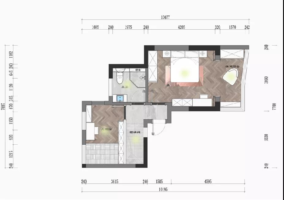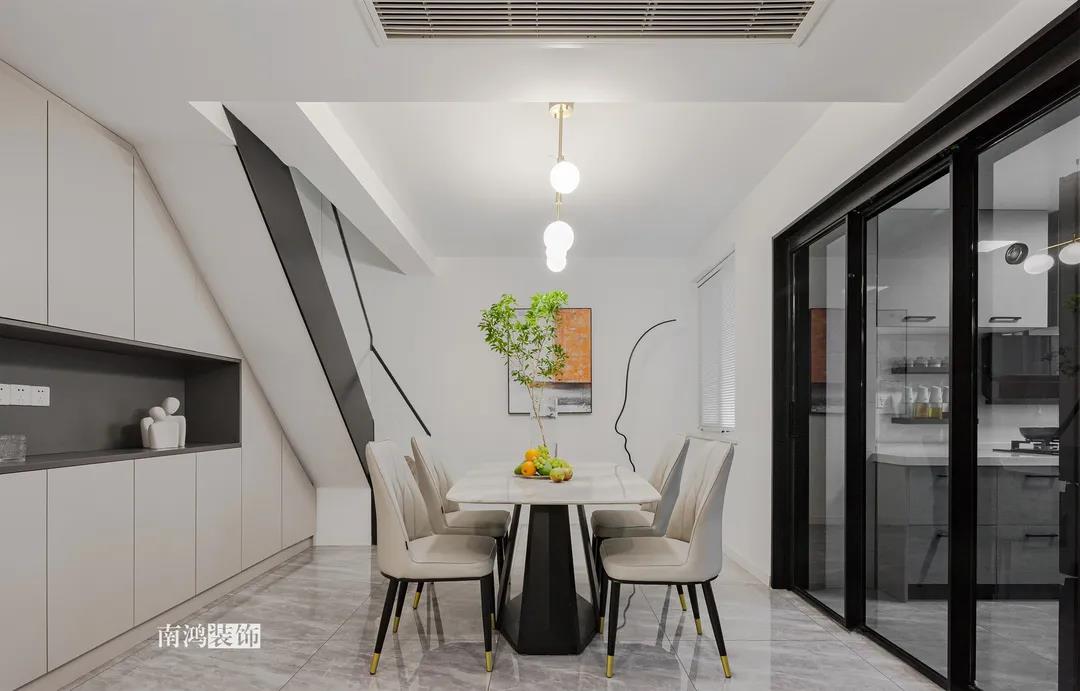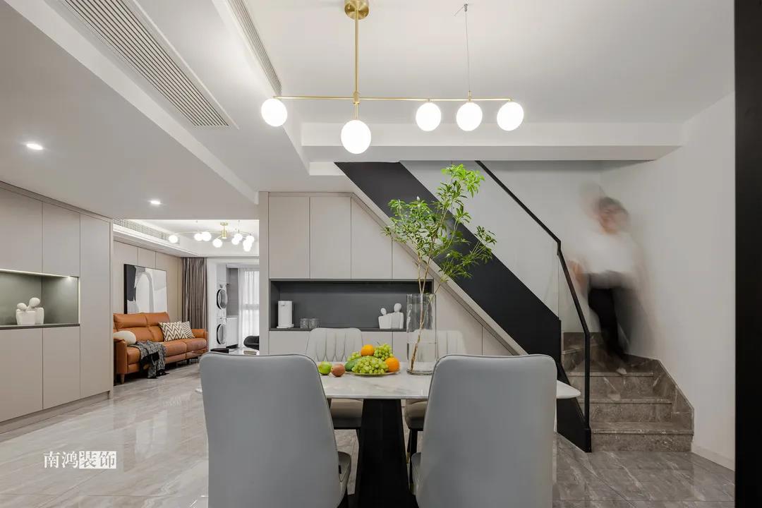 本案是一套現(xiàn)代輕奢風(fēng)格的復(fù)式作品,業(yè)主夫妻二人,暫無(wú)小孩子,房間上除主臥之外,保留了兩個(gè)次臥做父母房和兒童房,一樓寬敞通透的開(kāi)放式公區(qū)域設(shè)計(jì)成為本案一大亮點(diǎn)。 一層集合了日常所有的的煙火氣,蒸箱、烤箱、咖啡機(jī)、洗碗機(jī)、洗衣機(jī)...攜帶著一種隨性的自由,廚房到客廳依次構(gòu)成白與黑、疏與密、放與收的過(guò)渡對(duì)比,層次感的疊加形成舒適的視覺(jué)體驗(yàn)。 空間以暖調(diào)的木飾面色搭配黑白灰作為整體基調(diào),簡(jiǎn)約利落又不失家的溫馨。 戶型分析 ▼ 原始戶型存在一樓空間相對(duì)擁擠,樓梯陡峭,走起來(lái)費(fèi)力,二樓空間利用率不高等問(wèn)題。 1、樓梯位置調(diào)整,打造多個(gè)收納展示空間。 2、原有結(jié)構(gòu)陽(yáng)臺(tái)納入室內(nèi),擴(kuò)大客廳使用面積和直接采光面。 3、廚房門(mén)洞改變方向,消除了原廚房與客餐廳的隔閡,打造一體化、全開(kāi)放的格 局。 入戶區(qū)迎面而來(lái)一層開(kāi)放大格局,往左為客廳,視野通透舒暢。定制儲(chǔ)物柜滿足基本的收納需求,色彩由淺入深,層次清晰分明,滿足功能的同時(shí)不失視覺(jué)美感。 青草綠點(diǎn)綴出小清新,柜內(nèi)設(shè)計(jì)隱藏式燈帶,見(jiàn)光不見(jiàn)燈的效果,簡(jiǎn)單一筆勾勒出空間輪廓與光影質(zhì)感。 客 廳 LIVING ROOM 美觀大方的客廳空間,左右兩側(cè)維系著剛剛好的距離,溫和的底色在視覺(jué)上減輕了壓迫感。大理石與木飾面結(jié)合的電視背景,搭配硬包,皮藝沙發(fā)和單椅,顯出輕奢意味。 黑白灰三色搭配的餐廳空間,點(diǎn)綴的金屬材質(zhì)點(diǎn)亮活力。開(kāi)敞明亮的用餐環(huán)境,兩側(cè)都留有足夠大的通道距離,應(yīng)對(duì)日常的社交聚餐可以說(shuō)毫無(wú)壓力。 空間的時(shí)尚高級(jí)感,除了整體硬裝、家具的造型選擇之外,更重要在于細(xì)節(jié)的雕琢。由樓梯下來(lái)的白凈墻面,除了懸掛常規(guī)的裝飾畫(huà)外,由黑色線條勾勒的人像圖形也頗有趣味,讓人能感受到一種自在而愉悅的氛圍。 灰色向來(lái)是現(xiàn)代感家居的寵兒,沉靜色彩更能凸顯質(zhì)感。 廚 房 KITCHEN 廚房與餐廳以玻璃門(mén)相隔,保持視覺(jué)的通暢,U型設(shè)計(jì)極大地提高空間利用率,洗菜、切菜、烹炒動(dòng)線流暢,高效下廚輕輕松松。 主臥包入陽(yáng)臺(tái)打造為休閑區(qū),床頭背景清新的淺藍(lán)色與床品的灰色、單椅的橙色形成了具有層次感的溫馨格調(diào)。 床尾打造女主人的梳妝臺(tái),豎線條裝飾營(yíng)造縱橫維度的立體感,與留白的墻面相映襯,豐富了主臥空間的現(xiàn)代意象。 休閑陽(yáng)臺(tái)除了一把單椅外,還有造型輕巧的穿衣鏡與掛衣架,生活的小確幸就在一點(diǎn)一滴的細(xì)節(jié)間把握。 長(zhǎng)輩房藏在客廳隱形門(mén)背后,不增添過(guò)多修飾的空間更加簡(jiǎn)約耐看,偶爾來(lái)小住的父母也有了私密的休憩之地。 長(zhǎng)虹玻璃門(mén)引入外部光線,保證衛(wèi)浴室的明凈感受。壁掛馬桶不留衛(wèi)生死角,方便日常清潔。黑色的五金件隱隱占據(jù)視覺(jué)主導(dǎo),將利落的現(xiàn)代感盡可能放大。