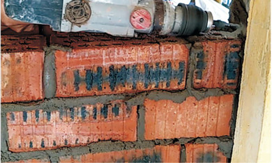 新砌墻體頂部九五磚雙向斜切磚縫抹灰均勻(嚴(yán)禁多孔磚側(cè)向砌筑)